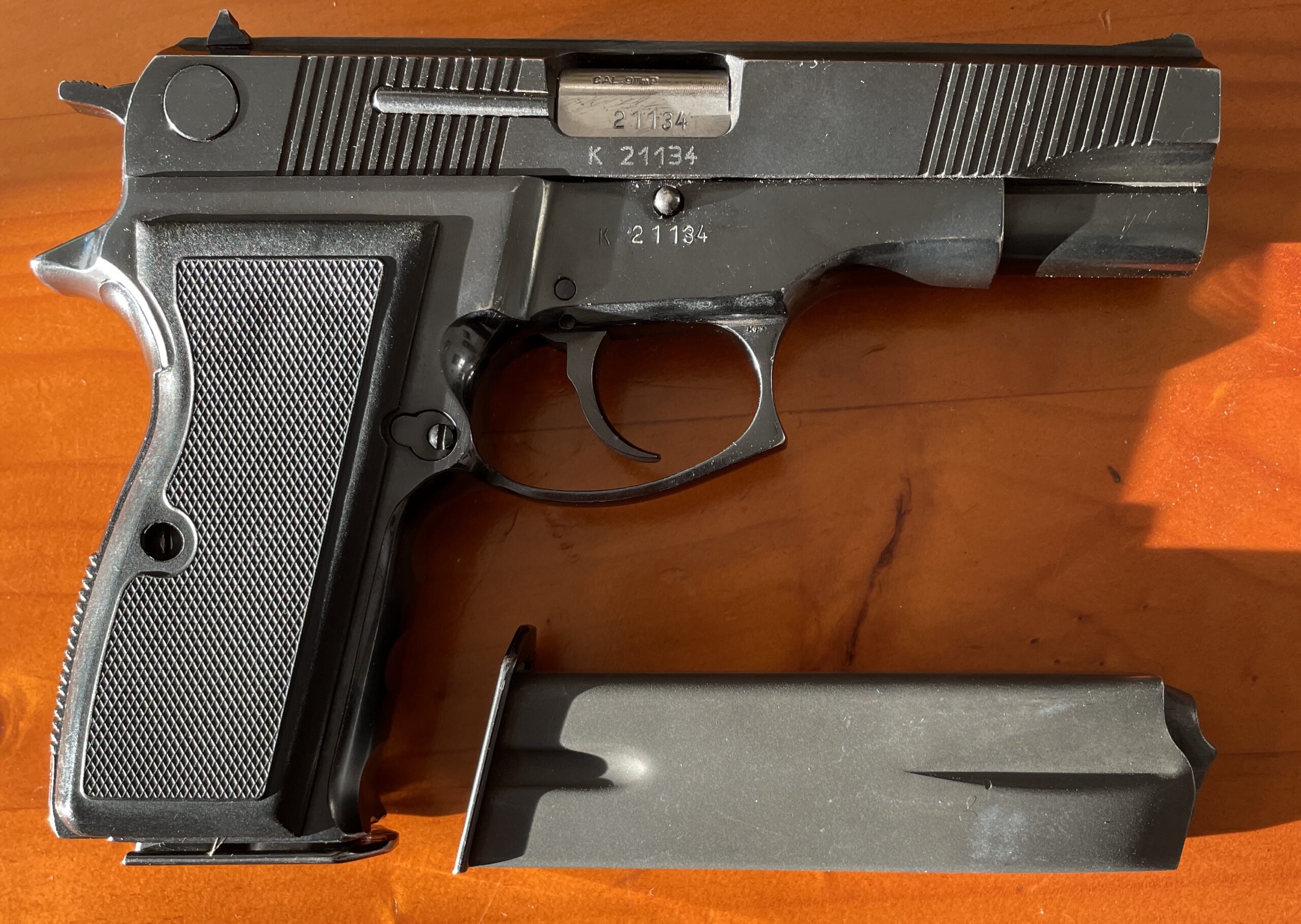 Die Pistole gehört größenmäßig zur klassischen Dienstpistolen‑Kategorie (ähnliche Dimensionen wie viele Militär‑ oder Polizeipistolen im 9‑mm‑Kaliber).
