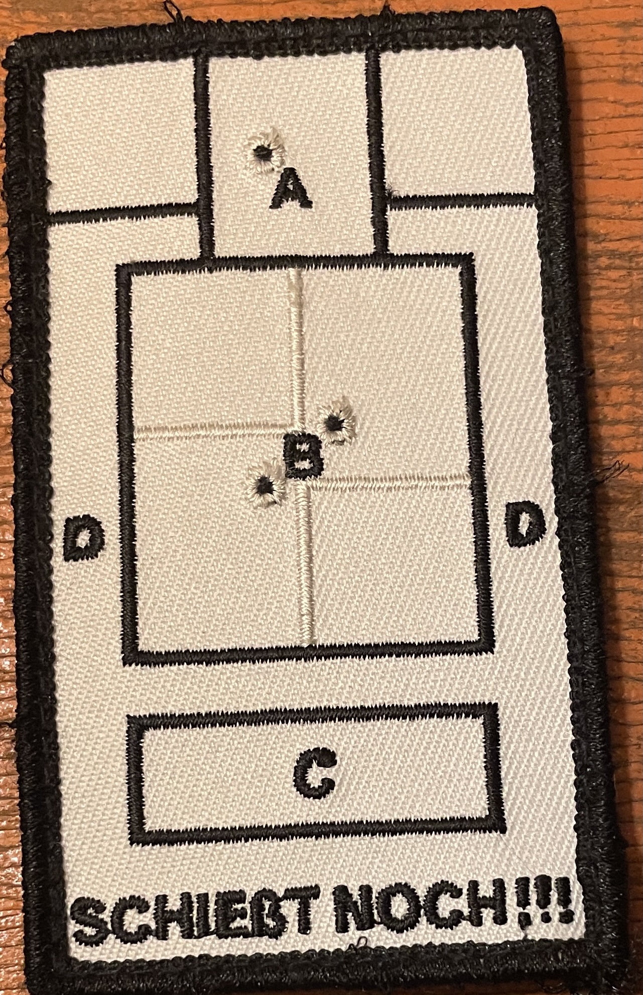 Motiv: Text-Patch mit dem Schriftzug „Schießt noch“