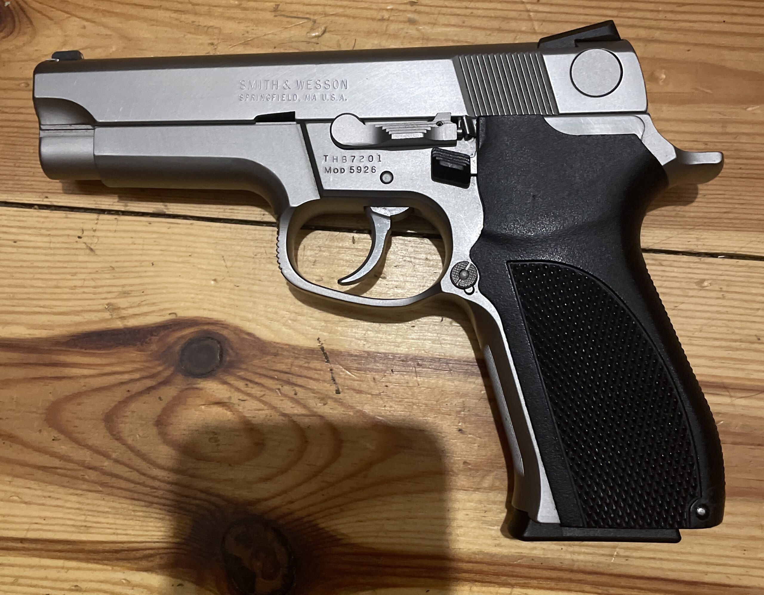 Die Smith&Wesson 5926 ist eine klassisch gestaltete halbautomatische Pistole im Kaliber 9×19 mm Luger (9 mm Para) aus der 5900er-Serie der dritten Generation von Smith & Wesson. Sie wurde anfangs der 1990er Jahre (ca. 1990–1992) gefertigt und kombiniert robuste Ganzstahl-Konstruktion, verlässliche Mechanik und ein klassisches Double-Action/Single-Action-Abzugssystem – Eigenschaften, durch die sie sowohl für Sportschützen als auch Verteidigungs- und Trainingszwecke geschätzt wird.