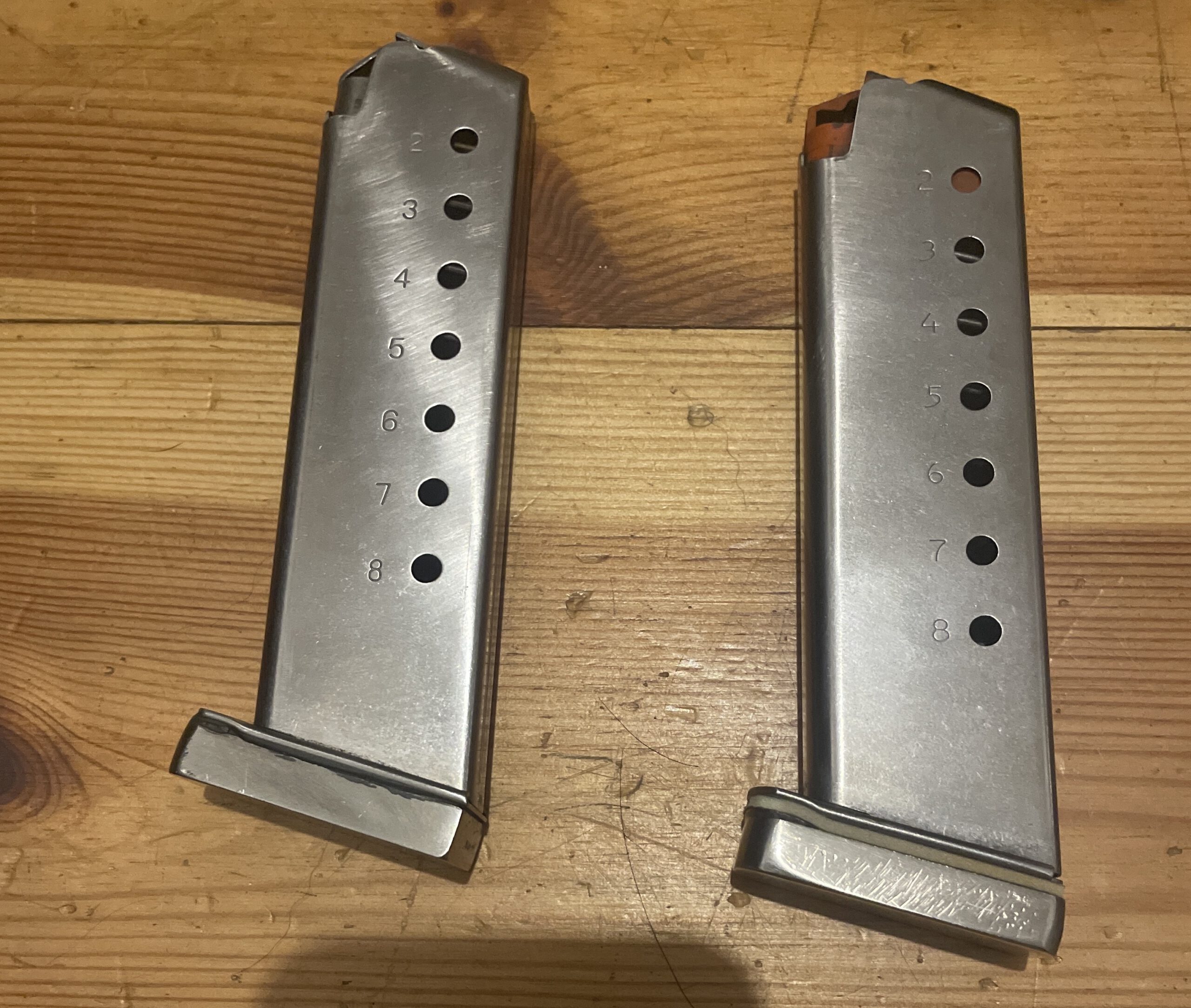 Magazin: Abnehmbares 8-Schuss-Box-Magazin im Kaliber .45 ACP – typisch für Pistolen dieser Ära.